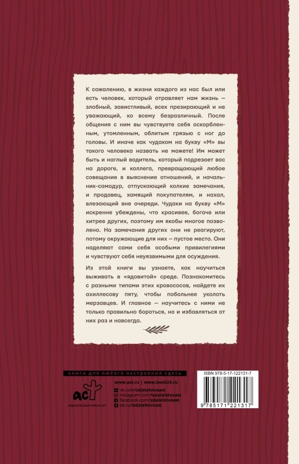К сожалению, в жизни каждого из нас был или есть человек, который отравляет нам жизнь – злобный, завистливый, всех презирающий и не уважающий, ко всему безразличный. После общения с ним вы чувствуете себя оскорбленным, утомленным, облитым грязью с ног до головы. И иначе как чудаком на букву «М» вы такого человека назвать не можете! Им может быть и наглый водитель, который подрезает вас на дороге, и коллега, превращающий любое совещание в выяснение отношений, и начальник-самодур, отпускающий колкие замечания, и продавец, хамящий покупателям, и нахал, влезающий вне очереди. Чудаки на букву «М» искренне убеждены, что красивее, богаче или хитрее других, поэтому им якобы многое позволено. На замечания других они не реагируют, потому окружающие для них – пустое место. Они наделяют сами себя особыми привилегиями и чувствуют себя неуязвимыми для осуждения.
