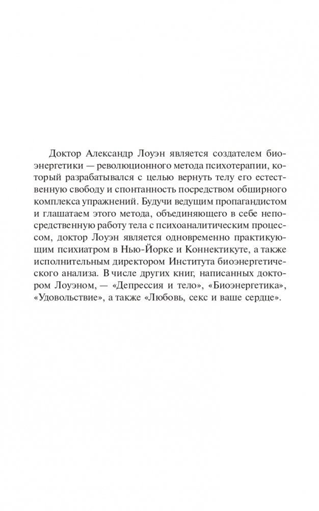 В этой книге известный психотерапевт доктор Лоуэн объясняет, как любой человек может вернуть то неповторимое состояние естественной радости, которое уходит от нас вместе с детством. С помощью простых упражнений вы освободите энергию искренних чувств, сделаете свою жизнь яркой и гармоничной, а себя — уверенными и счастливыми.