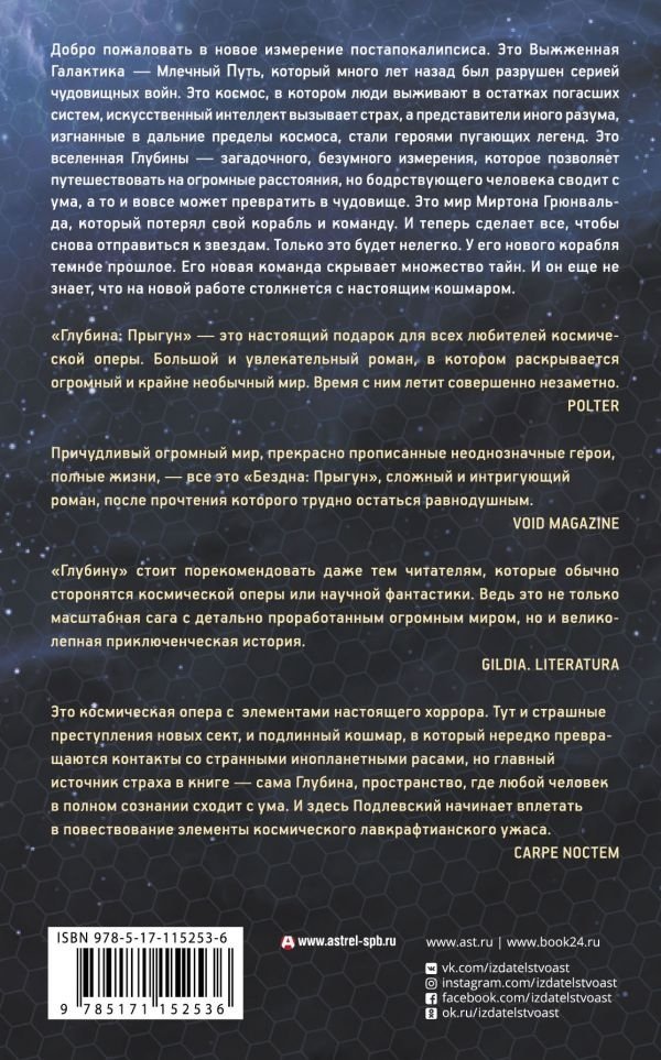 Добро пожаловать в новое измерение постапокалипсиса. Это Выжженная Галактика – Млечный путь, который много лет назад был разрушен серией чудовищных войн. Это космос, в котором люди выживают в остатках погасших систем, искусственный интеллект вызывает страх, а представители иного разума, изгнанные в дальние пределы космоса, стали героями пугающих легенд. Это вселенная Глубины – загадочного, безумного измерения, которое позволяет путешествовать на огромные расстояния, но бодрствующего человека сводит с ума, а то и вовсе может превратить в чудовище. Это мир Миртона Грюнвальда, который потерял свой корабль и команду. И теперь сделает все, чтобы снова отправиться к звездам. Только это будет нелегко. У его нового корабля темное прошлое. Его новая команда скрывает множество тайн. И он еще не знает, что новая работа столкнет его с настоящим кошмаром.