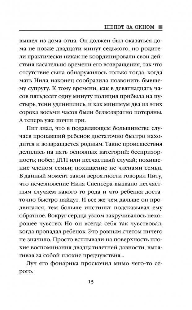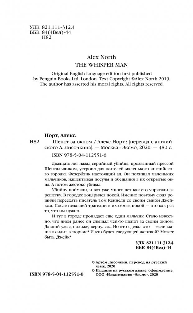 Двадцать лет назад серийный убийца, прозванный прессой Шептальщиком, устроил для жителей маленького английского городка Фезербэнк настоящий ад. Он похищал маленьких мальчиков, нашептывая посулы и обещания в их открытые окна. А потом жестоко убивал. Убийцу поймали, и вот уже много лет как его упрятали за решетку. В городке воцарился покой. Именно поэтому сюда решили переехать писатель Том Кеннеди со своим сыном Джейком. После недавней трагедии в их семье, покой — это как раз то, что им нужно. И тут в городе пропадает еще один мальчик. Стало известно, что днем ранее он слышал чей-то шепот за своим окном. Давний ужас, похоже, вернулся... Но кто сделал это — если маньяк сидит в тюрьме? И кто будет следующей жертвой? Может быть, Джейк?
