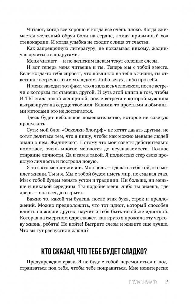 Жестко, иногда грубо, но действенно автор будет вести тебя к результату. Ты раскроешь свой потенциал и никогда не сможешь жить как прежде. Ты не найдешь ни в одной другой книге такой мощный кнут и такой сладкий пряник. Успех этой книги не в том, чтобы указать тебе на ошибки и сказать, что у тебя все получится. Наоборот! В книге ты буквально за руку с автором пойдешь в мир, в котором принято любить. Себя. Свою жизнь. И в которой действительно будут любить тебя. Никакой психологии! Только действия, задания и мощнейший заряд мотивации.