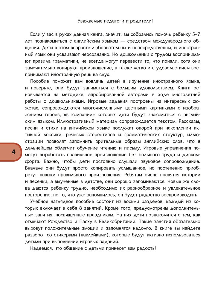 В книге представлен иллюстративный материал в виде сюжетных игровых заданий, тексты стихов и песен для воспитанников старшей группы (от 5 до 7 лет), способствующие реализации задач образовательной области «Развитие речи и культура речевого общения (иностранный язык)» учебной программы дошкольного образования.