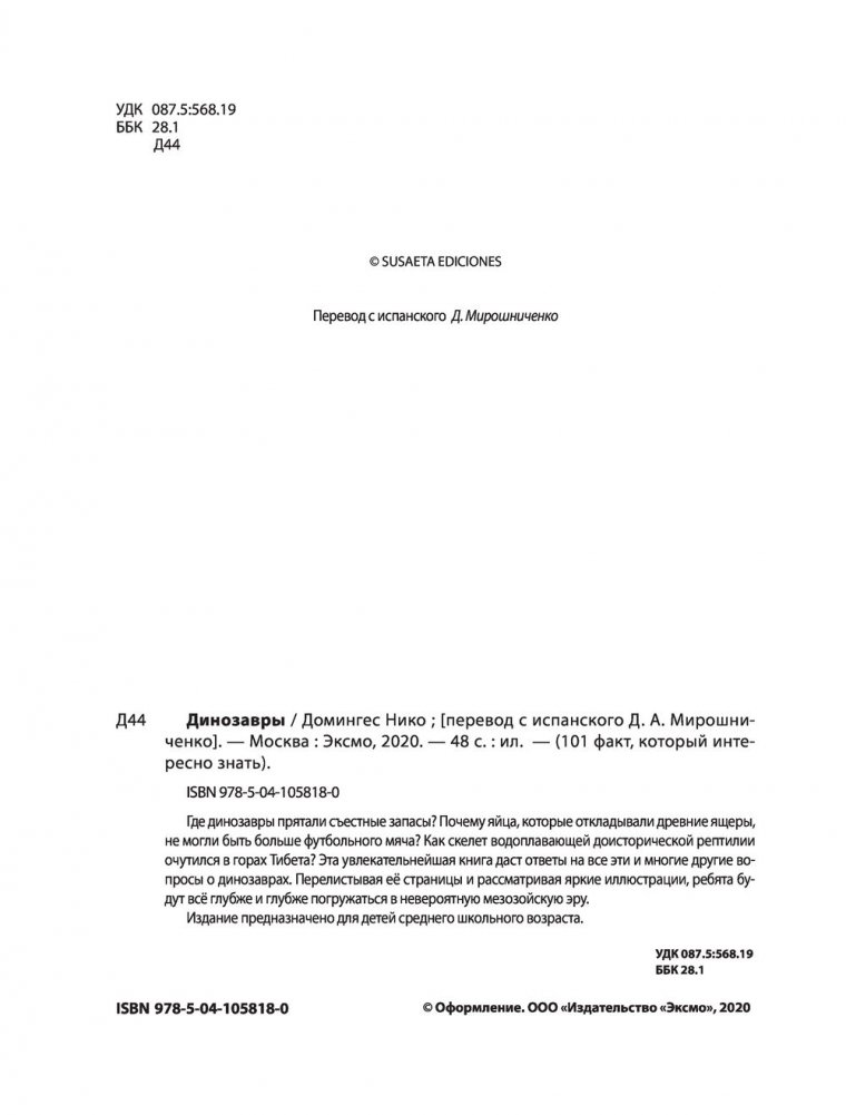 Эта книга станет отличным подарком для ребят, увлекающихся динозаврами и стремящихся узнать о них всё самое интересное. Здесь нет сложных длинных статей и малопонятных терминов — только любопытнейшие факты, изложенные доступным и образным языком, плюс большие яркие изображения древних ящеров!