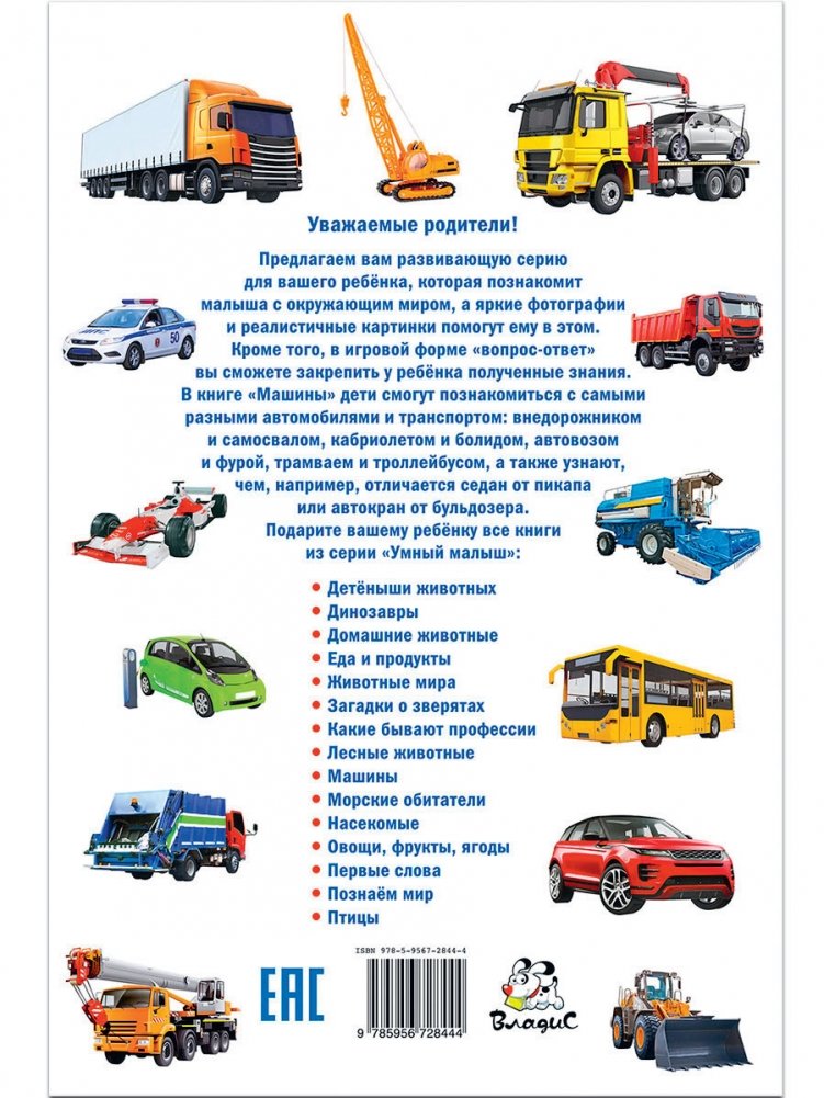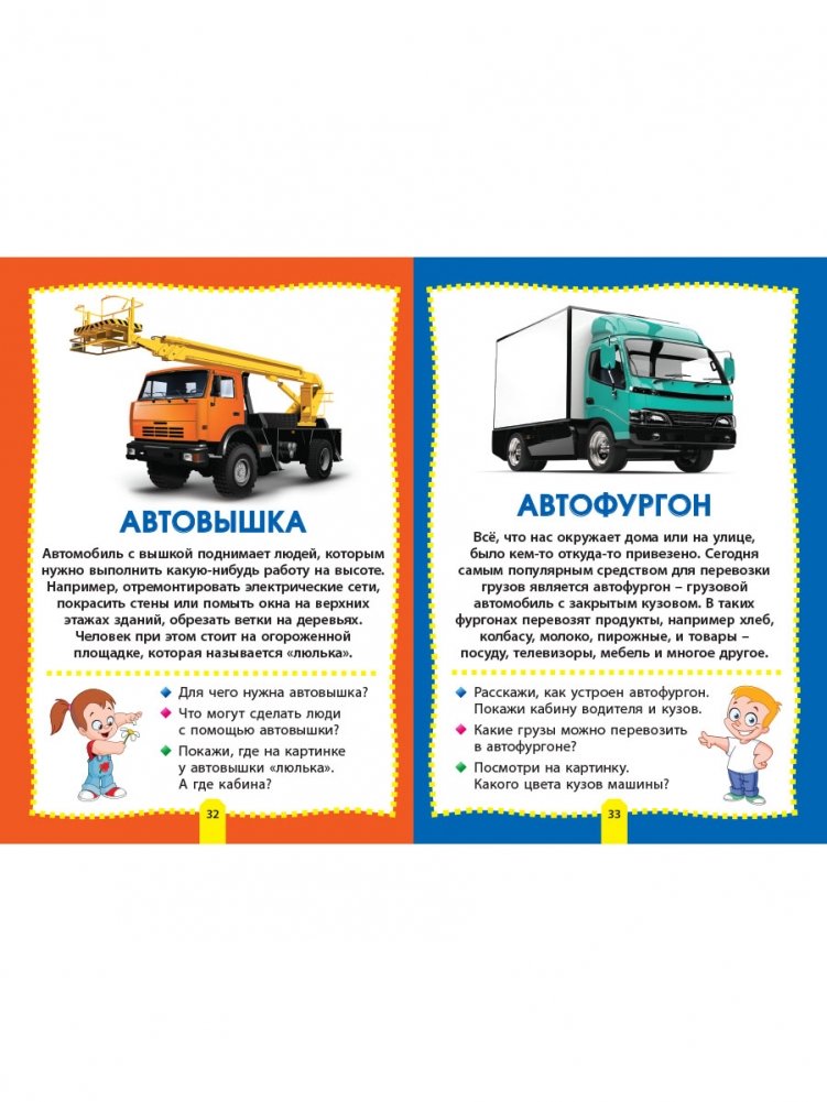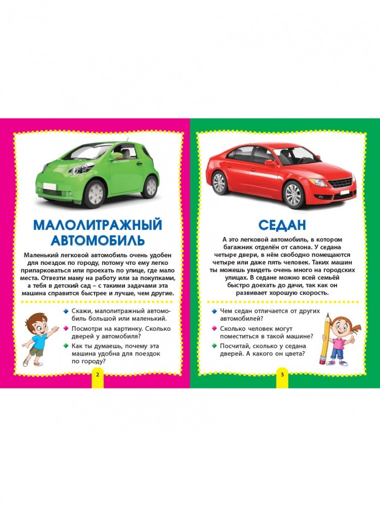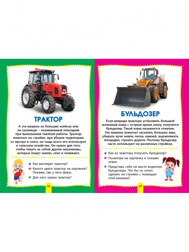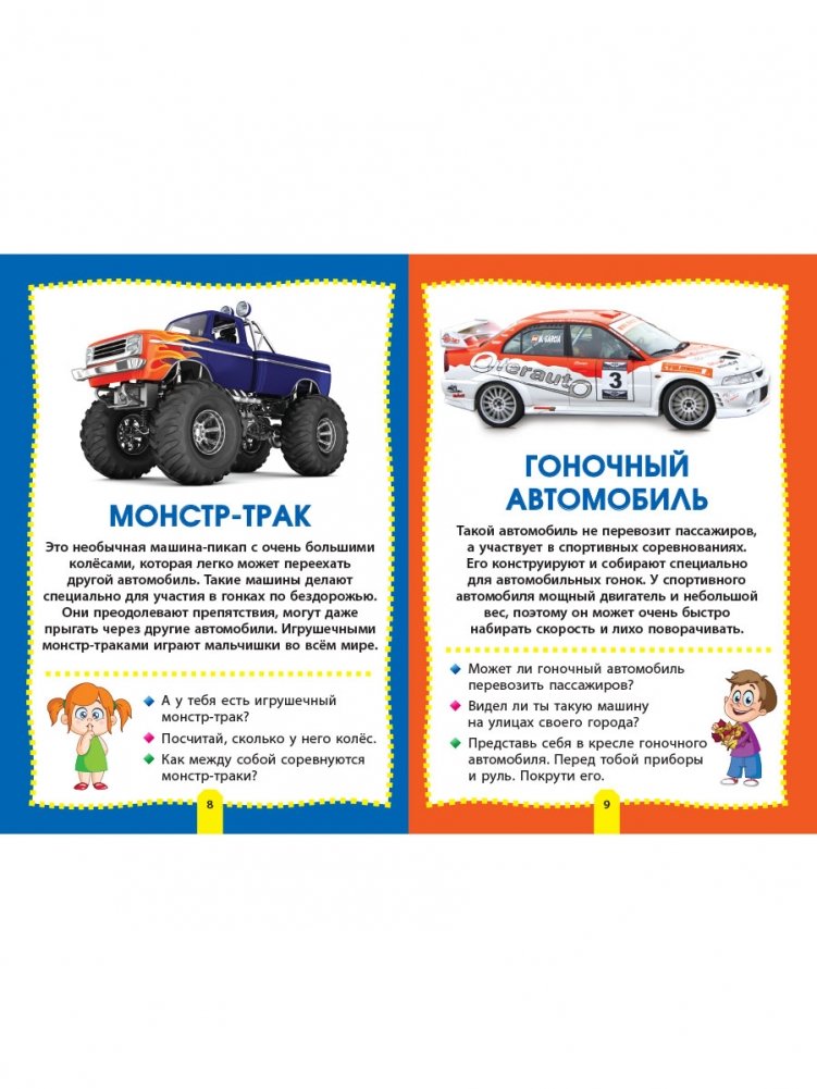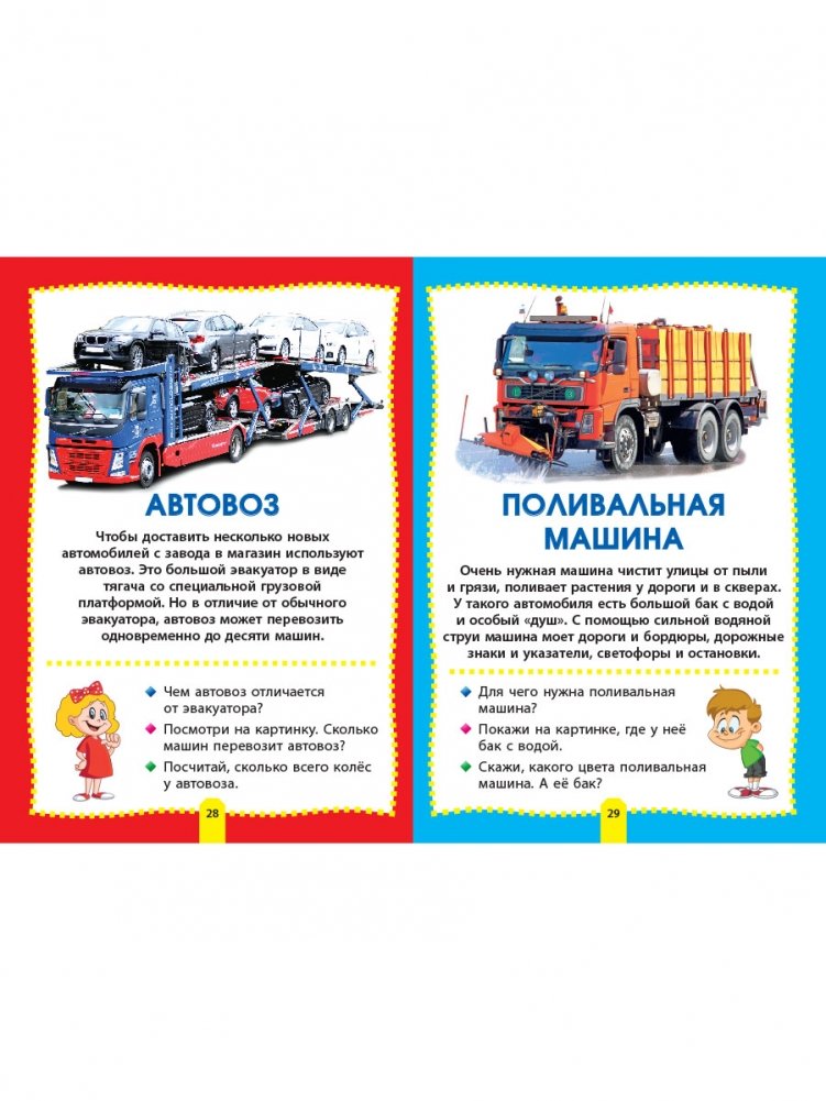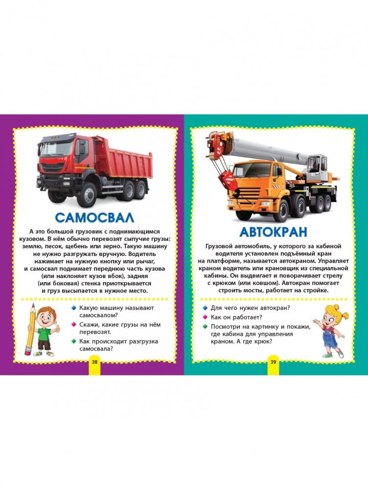 В книге «Машины» дети смогут познакомиться с самыми разными автомобилями и транспортом: внедорожником и самосвалом, кабриолетом и болидом, автовозом и фурой, трамваем и троллейбусом, а также узнают, чем, например, отличается седан от пикапа или автокран от бульдозера.