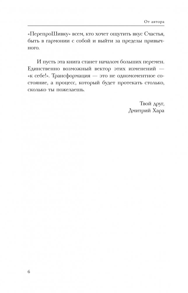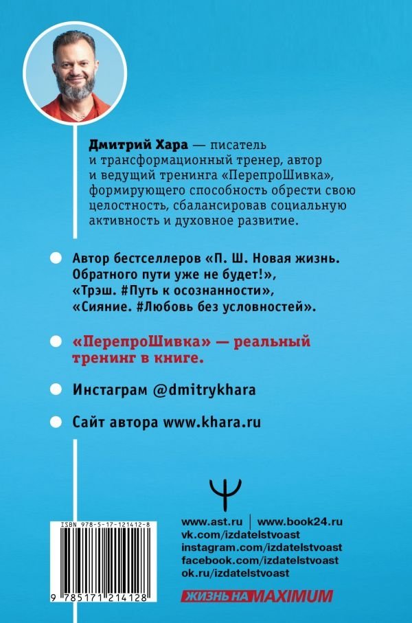 Дмитрий Хара – современный философ, автор знаменитого тренинга «ПерепроШивка», поможет настроиться на вектор изменений, понять источник происходящих с вами событий, побед и поражений; создать мир вокруг себя таким, чтобы в нем было хорошо и радостно.