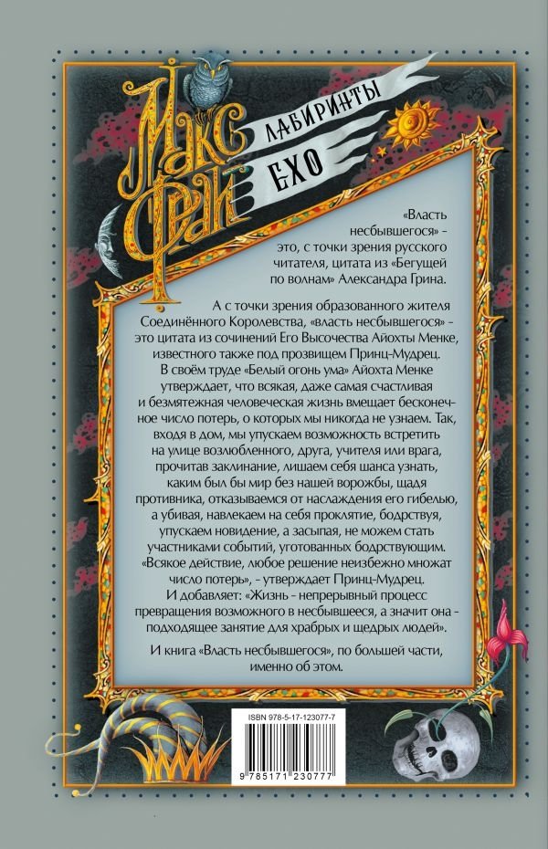 «Власть несбывшегося» – это, с точки зрения русского читателя, цитата из «Бегущей по волнам» Александра Грина. А с точки зрения образованного жителя Соединённого Королевства, «власть несбывшегося» – это цитата из сочинений Его Высочества Айохты Менке, известного также под прозвищем Принц-Мудрец. В своём труде «Белый огонь ума» Айохта Менке утверждает, что всякая, даже самая счастливая и безмятежная человеческая жизнь вмещает бесконечное число потерь, о которых мы никогда не узнаем. Так, входя в дом, мы упускаем возможность встретить на улице возлюбленного, друга, учителя или врага, прочитав заклинание, лишаем себя шанса узнать, каким был бы мир без нашей ворожбы, щадя противника, отказываемся от наслаждения его гибелью, а убивая, навлекаем на себя проклятие, бодрствуя, упускаем сновидение, а засыпая, не можем стать участниками событий, уготованных бодрствующим. «Всякое действие, любое решение неизбежно множат число потерь», – утверждает Принц-Мудрец. И добавляет: «Жизнь – непрерывный процесс превращения возможного в несбывшееся, а значит она – подходящее занятие для храбрых и щедрых людей». И книга «Власть несбывшегося», по большей части, именно об этом.