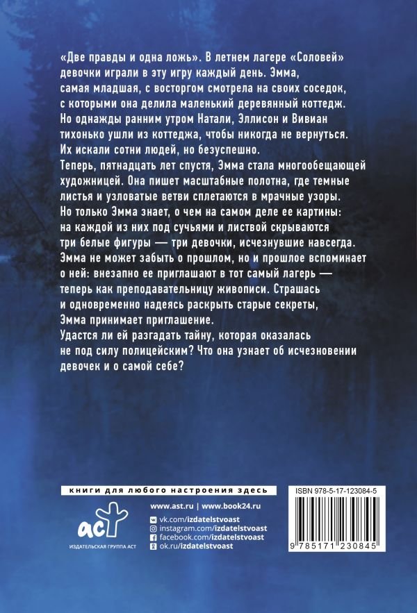 "Две правды и одна ложь". В летнем лагере "Соловей" девочки играли в эту игру каждый день. Эмма, самая младшая, с восторгом смотрела на своих соседок, с которыми она делила маленький деревянный коттедж. Но однажды ранним утром Натали, Эллисон и Вивиан тихонько ушли из коттеджа, чтобы никогда не вернуться. Их искали сотни людей, но безуспешно. Теперь, пятнадцать лет спустя, Эмма стала многообещающей художницей. Она пишет масштабные полотна, где темные листья и узловатые ветви сплетаются в мрачные узоры. Но только Эмма знает, о чем на самом деле ее картины: на каждой из них под сучьями и листвой скрываются три белые фигуры — три девочки, исчезнувшие навсегда. Эмма не может забыть о прошлом, но и прошлое вспоминает о ней: внезапно ее приглашают в тот самый лагерь — теперь как преподавательницу живописи. Страшась и одновременно надеясь раскрыть старые секреты, Эмма принимает приглашение. Удастся ли ей разгадать тайну, которая оказалась не под силу полицейским? Что она узнает об исчезновении девочек и о самой себе?