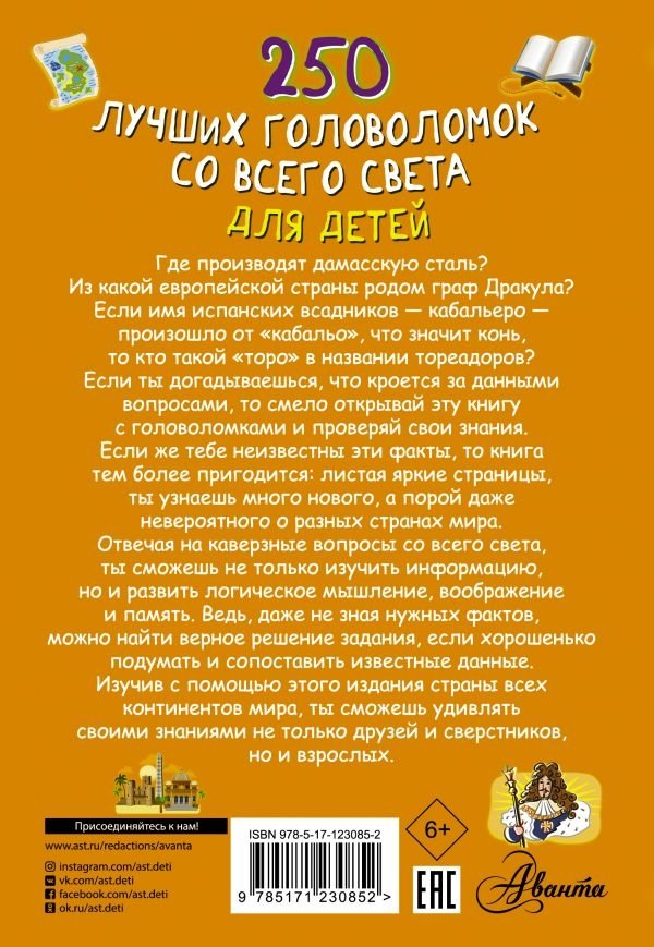 Путешествие - это всегда весело и очень познавательно, ведь, посещая разные места, ты обязательно узнаешь что-то необычное о живущем там народе, его культуре, истории и традициях. Однако чтобы открывать для себя новые страны, необязательно куда-то ехать. Мы предлагаем отправиться в интеллектуальное путешествие с этой книгой. Отвечая на каверзные вопросы, содержащиеся на ее страницах, и изучая страны и территории, ты не только значительно пополнишь свой багаж знаний, но и сможешь развить логическое мышление и умственные способности. даже если какая-то головоломка заведет тебя в тупик, ты всегда найдешь решение в конце соответствующего раздела. Если же ты устанешь искать ответы к головоломным заданиям, то сможешь передохнуть за увлекательными играми, которые ты также встретишь на страницах этой книги.