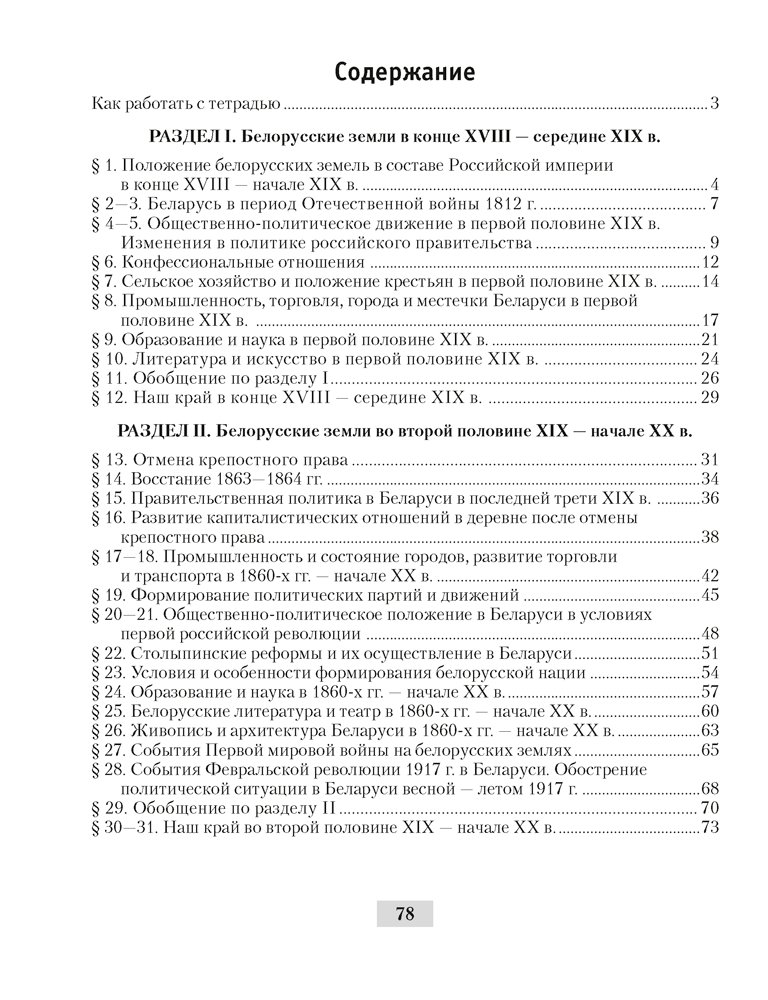 Содержание и структура рабочей тетради соответствует учебной программе и учебному пособию по истории Беларуси для 8 класса под редакцией В. А. Сосно. В тетради представлены задания, ориентированные на систематизацию и закрепление учащимися теоретического и фактологического содержания учебного материала, а также на формирование картографических и хронологических умений. Для удобства пользования карты в пособии представлены в виде картосхем.