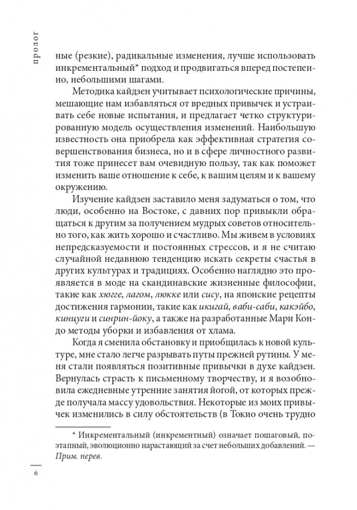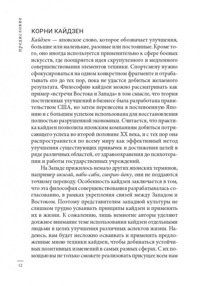 Из этой великолепно иллюстрированной книги вы узнаете, как безо всякого стресса приобретать полезные привычки и избавляться от вредных. Главное, что от вас потребуется, это не торопиться, находить решения, которые лучше всего подходят лично вам, и не сдаваться, когда что-то не будет получаться. Используя кайдзен для улучшения всех сторон вашей жизни (здоровья, отношений, финансов, карьеры или самосовершенствования), вы увидите, как легко можно справляться с собственными страхами и сомнениями. Кайдзен очень просто адаптируется к любому стилю жизни, что делает его чрезвычайно эффективным инструментом позитивных перемен.