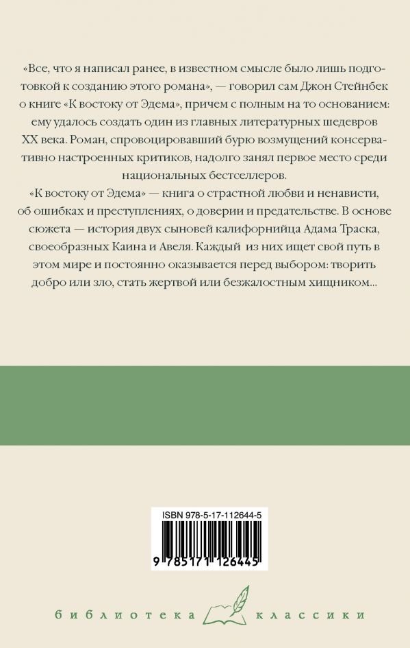 "К востоку от Эдема" – книга о страстной любви и ненависти, об ошибках и преступлениях, о доверии и предательстве. В основе сюжета – история двух сыновей калифорнийца Адама Траска, своеобразных Каина и Авеля. Каждый из них ищет свой путь в этом мире и постоянно оказывается перед выбором: творить добро или зло, стать жертвой или безжалостным хищником…