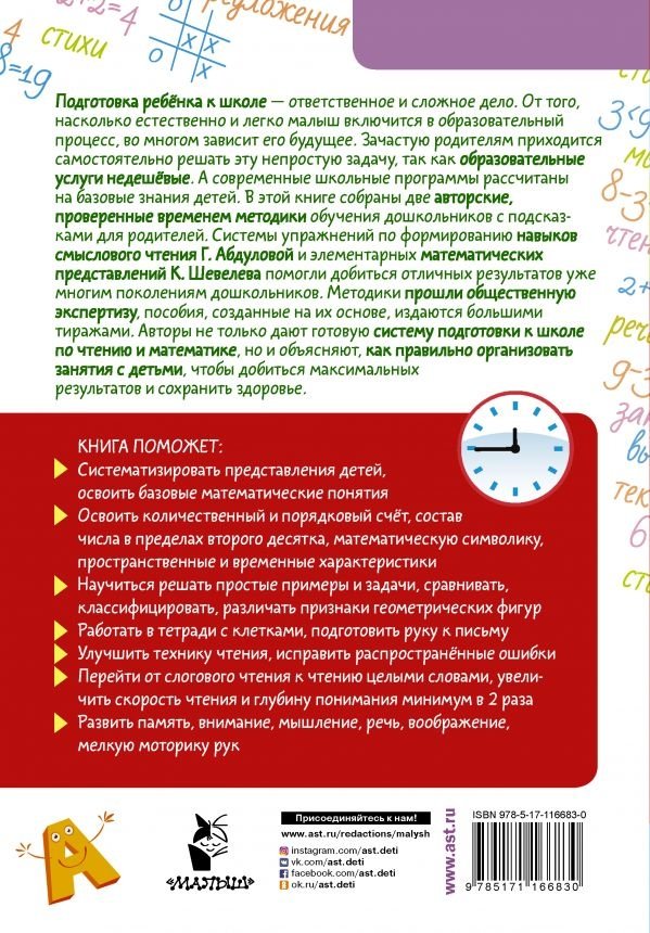 Подготовка ребёнка к школе — ответственное и сложное дело. От того, насколько естественно и легко малыш включится в образовательный процесс, во многом зависит его будущее. Зачастую родителям приходится самостоятельно решать эту непростую задачу, так как образовательные услуги недешёвые. А современные школьные программы рассчитаны на базовые знания детей. В этой книге представлены две авторские, проверенные временем методики обучения дошкольников с подсказками для родителей. Системы упражнений по формированию навыка смыслового чтения Г. Абдуловой и элементарных математических представлений К. Шевелева помогли добиться отличных результатов уже многим поколениям дошкольников. Методики прошли общественную экспертизу, пособия, созданные на их основе, издаются большими тиражами. Авторы не только дают готовую систему подготовки к школе по чтению и математике, но и объясняют, как правильно организовать занятия, чтобы добиться максимальных результатов и сохранить здоровье детей.