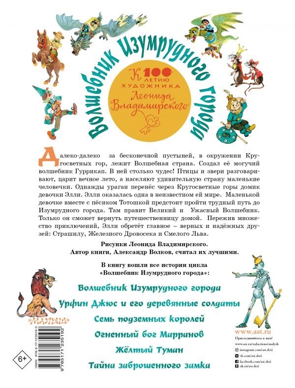 В книгу Александра Мелентьевича Волкова «Волшебник Изумрудного города. Все шесть книг — в одной!» вошли все сказочные истории о Волшебной стране: «Волшебник Изумрудного города», «Урфин Джюс и его деревянные солдаты», «Семь подземных королей», «Огненный бог Марранов», «Желтый туман» и «Тайна заброшенного замка». Жители Волшебной страны, маленькие человечки, — мирные, безобидные и совсем не умеют воевать. Это такое искушение для злых фей и честолюбивых завоевателей! Дружба, смекалка и доброта помогут добрым правителям Страшиле Мудрому, Железному Дровосеку и Смелому Льву справиться со всеми захватчиками. На помощь им придут отважные люди из обычного мира: девочка Элли, Фред, Чарли Блек, Энни и Тим. Ведь дружба превыше всего! В 2020 году художнику книги Леониду Владимирскому исполняется 100 лет. Автор книги Александр Волков считал его иллюстрации лучшими.