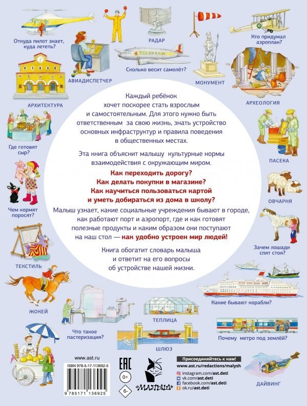 Малыш узнает, какие социальные учреждения бывают в городе, как работают порт и аэропорт, где и как готовят полезные продукты и каким образом они поступают на наш стол – как удобно устроен мир людей.