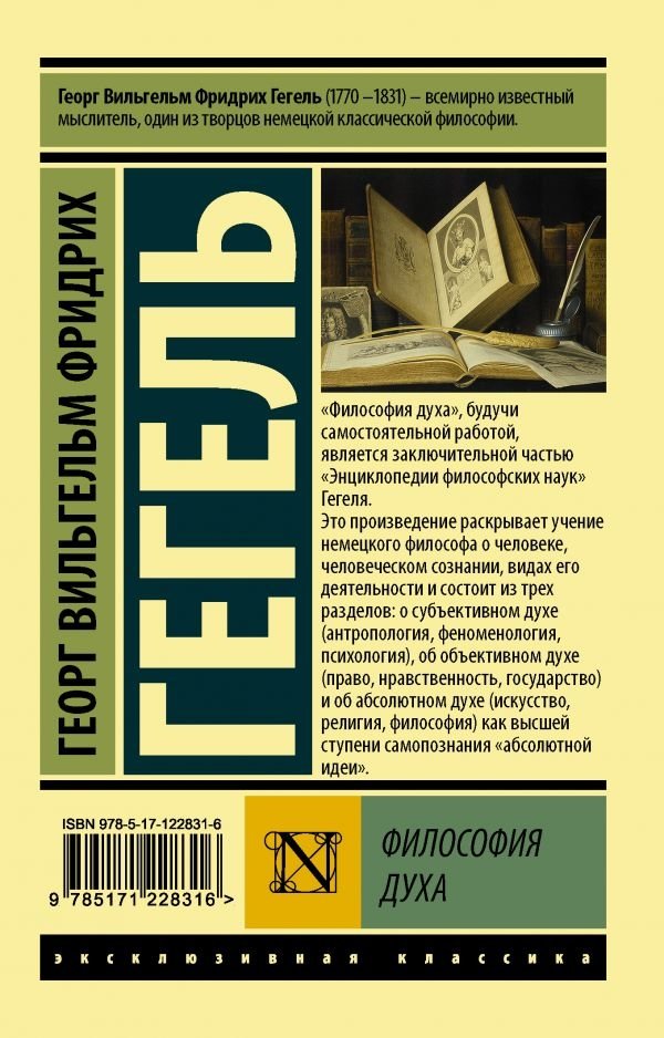 Это произведение раскрывает учение немецкого философа о человеке, человеческом сознании, видах его деятельности и состоит из трех разделов: о субъективном духе (антропология, феноменология, психология), об объективном духе (право, нравственность, государство) и об абсолютном духе (искусство, религия, философия), как высшей ступени самопознания «абсолютной идеи».