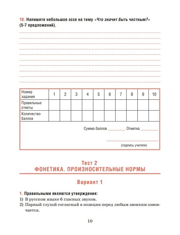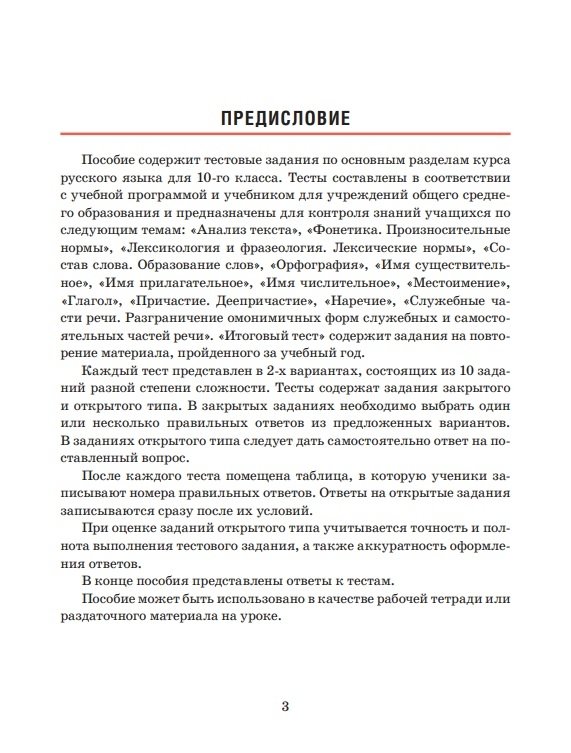 Пособие представляет собой сборник тестовых заданий по основным разделам курса русского языка, изучаемого в 10 классе. Тесты составлены в соответствии с учебной программой и учебником для учреждений общего среднего образования. Итоговый тест содержит задания на повторение материала, пройденного за весь учебный год.