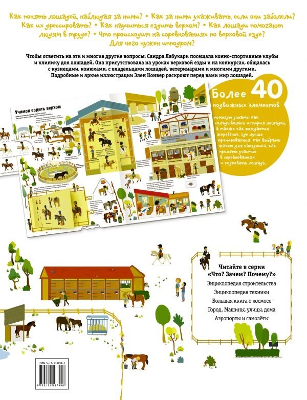 Как понять лошадей, наблюдая за ними? Как за ними ухаживать, если они заболели? Как их дрессировать? Как научиться ездить верхом? Как лошади помогают людям? Чтобы ответить на эти и многие другие вопросы, Сандра Лабукари посещала конно-спортивные клубы и клинику для лошадей. Она присутствовала на уроках верховой езды и на конкурсах, общалась с кузнецами, работниками конюшен, с владельцами лошадей, ветеринарами и многими другими. Более 40 подвижных элементов сделают экскурсию в мир лошадей увлекательной и незабываемой!