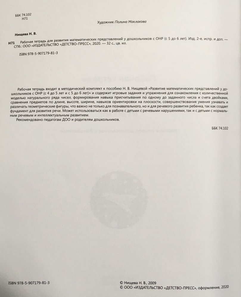 Рабочая тетрадь входит в комплект к методическому пособию "Развитие математических представлений у дошкольников с ОНР (с 4 до 5 и с 5 до 6 лет)".