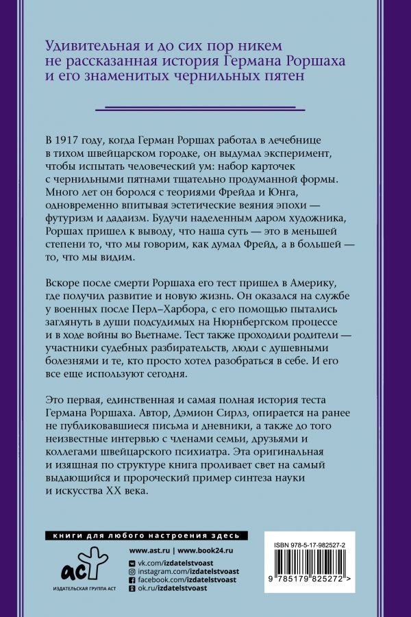 В 1917 году, когда Герман Роршах работал в лечебнице в тихом швейцарском городке, он выдумал эксперимент, чтобы испытать человеческий ум: набор карточек с чернильными пятнами тщательно продуманной формы. Много лет он боролся с теориями Фрейда и Юнга, одновременно впитывая эстетические веяния эпохи — футуризм и дадаизм. Будучи наделенным даром художника, Роршах пришел к выводу, что наша суть — это в меньшей степени то, что мы говорим, как думал Фрейд, а в большей — то, что мы видим. Увы, Роршах скоропостижно скончался, и вскоре после его смерти его тест пришел в Америку, где получил развитие и новую жизнь. Он оказался на службе у военных после Перл-Харбора, с его помощью пытались заглянуть в души подсудимых на Нюрнбергском процессе и в ходе войны во Вьетнаме. Он вошел в инструментарий рекламщиков, голливудских продюсеров и журналистов, послужил вдохновением для Энди Уорхола и даже Jay Z. Тест также проходили военнослужащие, соискатели, родители — участники судебных разбирательств, люди с душевными болезнями и те, кто хотел разобраться в себе. И его все еще используют сегодня. Это первая и единственная биография Германа Роршаха и культурная биография его теста. Автор, Дэмион Сирлз, опирается на ранее не публиковавшиеся письма и дневники, а также до того неизвестные интервью с членами семьи, друзьями и коллегами швейцарского психиатра. Он сумел рассказать историю создания теста, противоречивую историю его возрождения — о стойкости психиатрической и культурной концепции. Эта оригинальная и изящная по структуре книга проливает свет на самый выдающийся пример синтеза науки и искусства XX века.