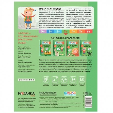 Книга «Окружающий мир 3+» из серии «Школа Семи Гномов. Активити с наклейками» предназначена для расширения кругозора и знаний об окружающем мире детей от 3 до 4 лет. Вместе с гномиком Юлой ребенок проработает ключевые навыки, решая разнообразные задачки по четырем тематическим блокам: предметное окружение, социальное окружение, мир природы, мир растений и животных. Задания расположены по мере усложнения, что делает процесс обучения еще более полезным и доступным для ребенка. Большое количество наклеек в этой книге не даст ребенку потерять интерес к занятиям, а главное, он обязательно получит удовольствие от учебного процесса.
