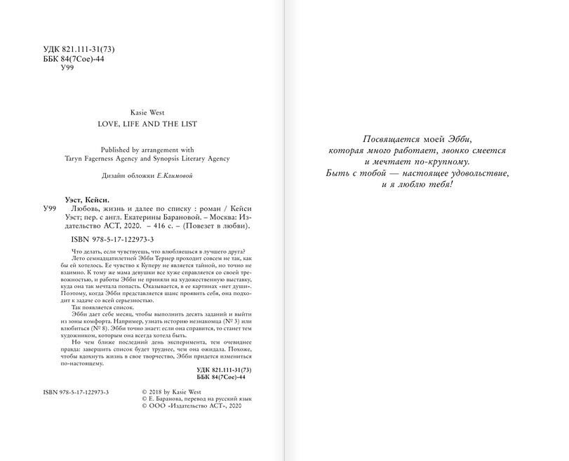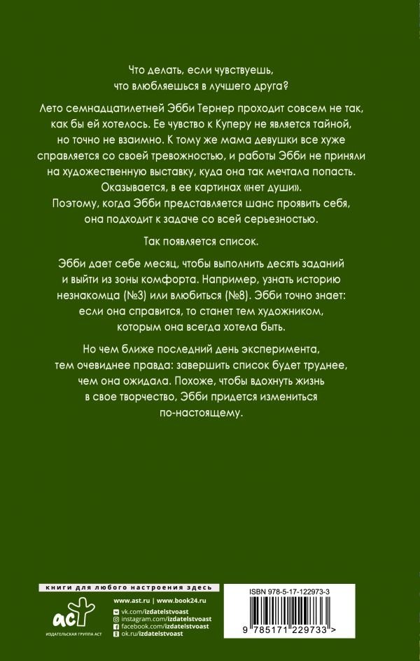 Например, узнать историю незнакомца (№ 3) или влюбиться (№ 8). Эбби точно знает: если она справится, то станет тем художником, которым она всегда хотела быть. Но чем ближе последний день эксперимента, тем очевиднее правда: завершить список будет труднее, чем она ожидала. Похоже, чтобы вдохнуть жизнь в свое творчество, Эбби придется измениться по-настоящему.