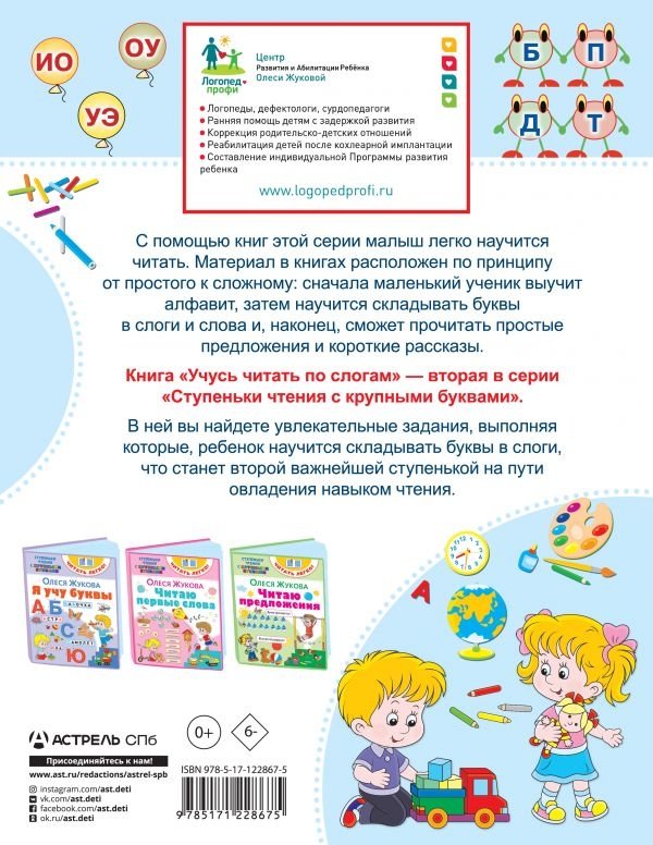 Книга «Учусь читать по слогам» – вторая в серии «Ступеньки чтения с крупными буквами». В ней вы найдете увлекательные задания, выполняя которые, ребенок научится складывать буквы в слоги, что станет второй важнейшей ступенькой на пути овладения навыком чтения.