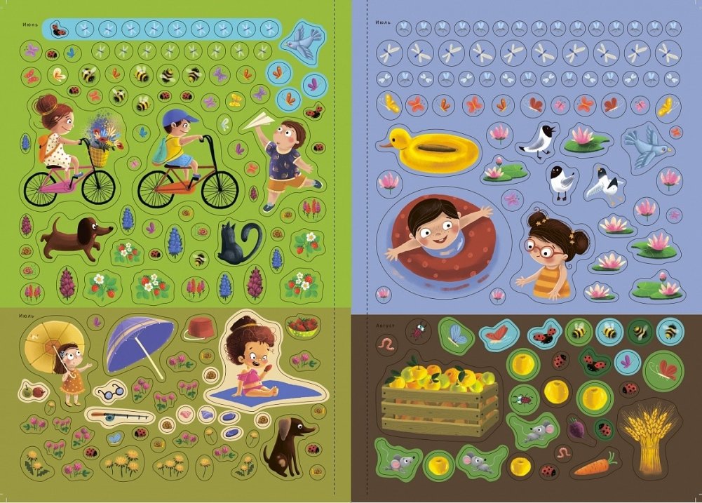 В ней вы найдёте 12 ярких тематических фонов каждого календарного месяца: январь, февраль, март, апрель и т.д., более 600 красочных наклеек, которые помогут ребёнку создавать собственные картины и познакомят с четырьмя сезонами: зима, весна, лето и осень, а также 12 стихов о временах года для развития речи и кругозора.
