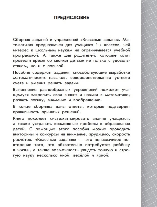 Пособие, соответствующее ФГОС, поможет учащимся 1 класса в занимательной форме закрепить навыки, полученные в школе, развить математические способности и математическое мышление, потренировать логику и внимание, а также повысить уровень IQ, улучшить успеваемость по предмету, интересно и с пользой провести время. Сборник может быть использован в качестве дополнительного материала в школе, для индивидуальной работы дома, для повторения знаний во время каникул.