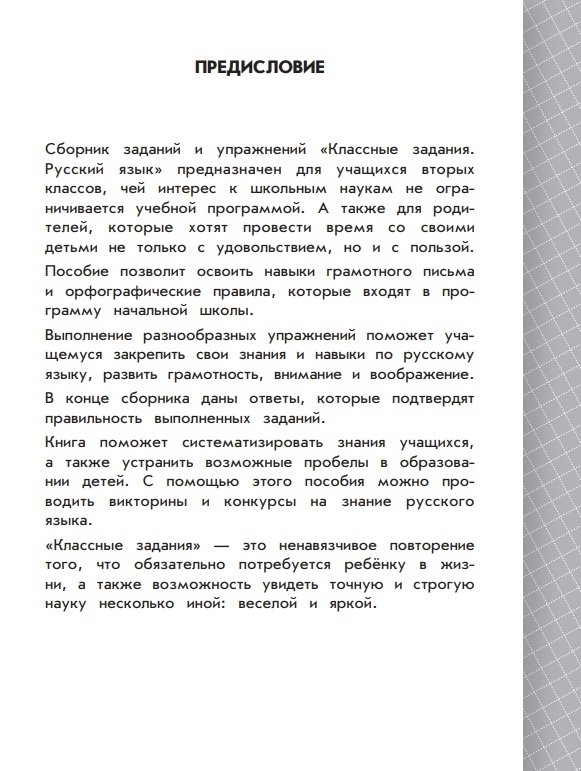 Пособие, соответствующее ФГОС, поможет учащимся 2 класса в занимательной форме закрепить навыки грамотного письма, развить орфографическую зоркость, потренировать логику и внимание, а также повысить уровень IQ, улучшить успеваемость по предмету, интересно и с пользой провести время. Сборник может быть использован в качестве дополнительного материала в школе, для индивидуальной работы дома, для повторения знаний во время каникул.