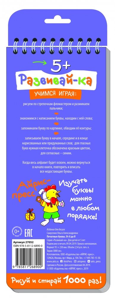 Благодаря специально подобранным картинкам-образам и развивающим заданиям многоразовые прописи помогут ребёнку быстро запомнить все печатные буквы русского алфавита, освоить их написание, провести работу над ошибками и сформировать красивый и аккуратный почерк.