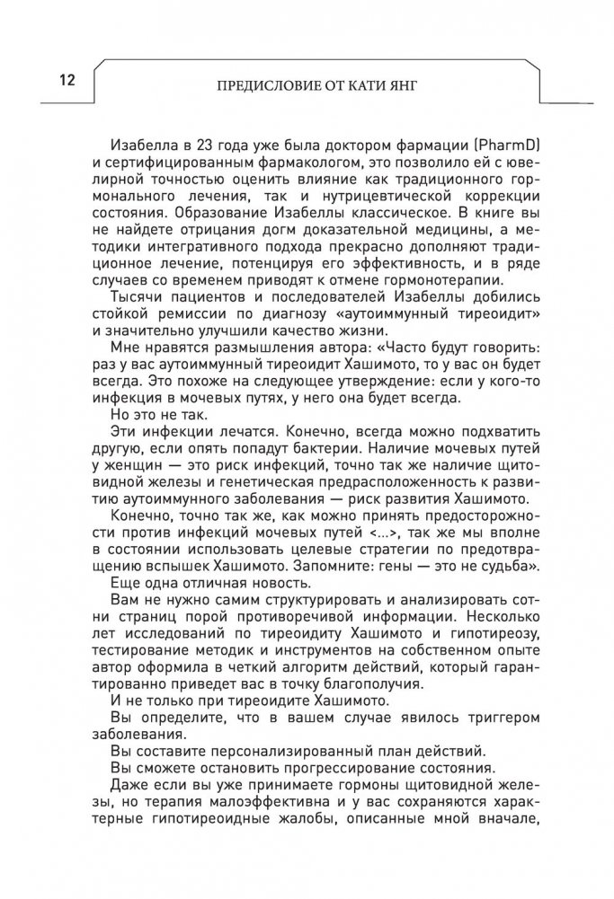 Иммунитет — надежная защита нашего организма от любых патогенов: инфекций, бактерий, вирусов, даже некоторых мутаций. Это армия различных лимфоцитов, которая призвана бороться с любыми захватчиками: распознавать их, отстреливать и съедать. И она борется. А судя по тому, что человечество еще не вымерло, борется весьма успешно. Но иногда возникают ситуации, когда собственный иммунитет начинает ошибочно принимать наши ткани, органы и системы за врагов и направлять всю силу реакции против них. Подобная ситуация — борьба иммунитета с собственным организмом — называется аутоиммунной реакцией. Сегодня в мире насчитывается огромное количество хронических (то есть неизлечимых) заболеваний, связанных с гиперактивной иммунной системой. Вы все их знаете: псориаз, синдром хронической усталости, рассеянный склероз, деменция, ревматоидный артрит. Но этот список возглавляет самое популярное аутоиммунное заболевание в мире — болезнь Хашимото. Благодаря книге вы узнаете, как и почему развиваются аутоиммунные реакции, что может стать триггерами (то есть отправными точками) для начала развития болезней, и познакомитесь с самыми страшными и неочевидными патогенами, которые окружают нас повсюду. А в конце получите протокол лечения, который позволит не только перевести в ремиссию начавшуюся болезнь, но и предотвратить развитие аутоиммунных реакций.