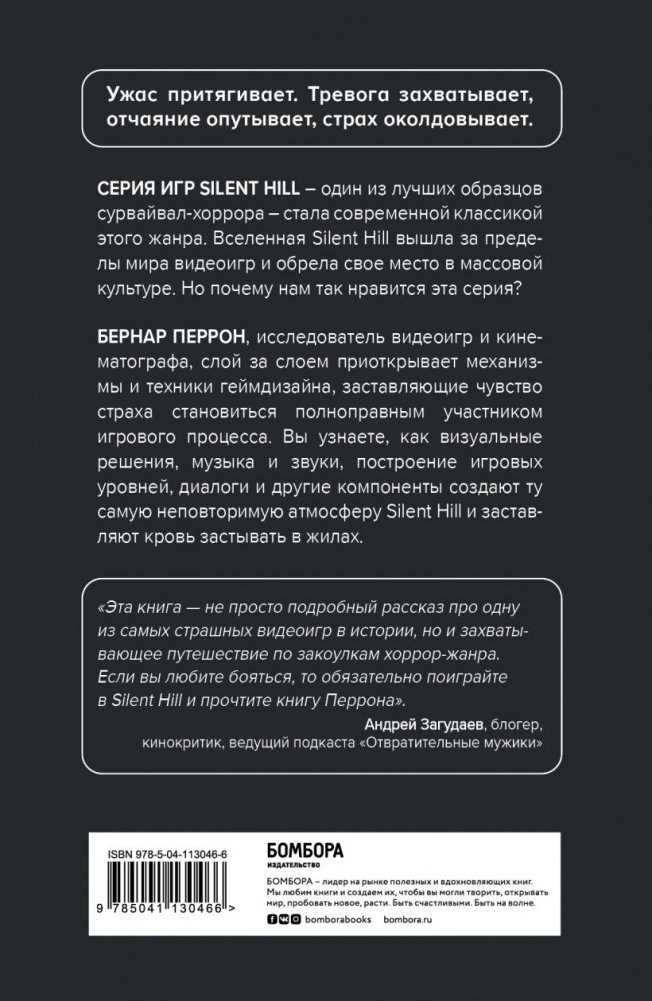 Silent Hill – горячо любимая многими серия игр в жанре сурвайвал-хоррор, плотно закрепившаяся в массовой культуре. О ней наслышаны даже далекие от мира видеоигр люди. Но в чем причина этой популярности? Бернар Перрон слой за слоем деконструирует техники и приемы знаменитой серии, которая околдовывают игроков, заставляя их сердца биться чаще. Вы узнаете, как визуальная составляющая, звуки, музыка, игровые механики, построение игрового повествования и многие другие компоненты создают незабываемый игровой опыт, а также почему, несмотря на испытываемые ужас и страх, игроки получают огромное удовольствие от прохождения Silent Hill.