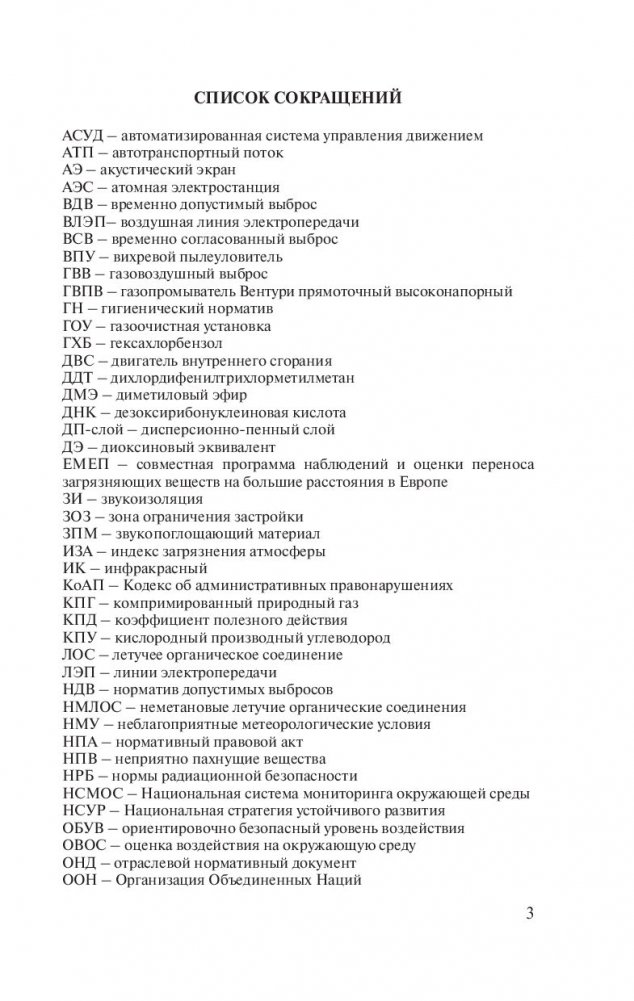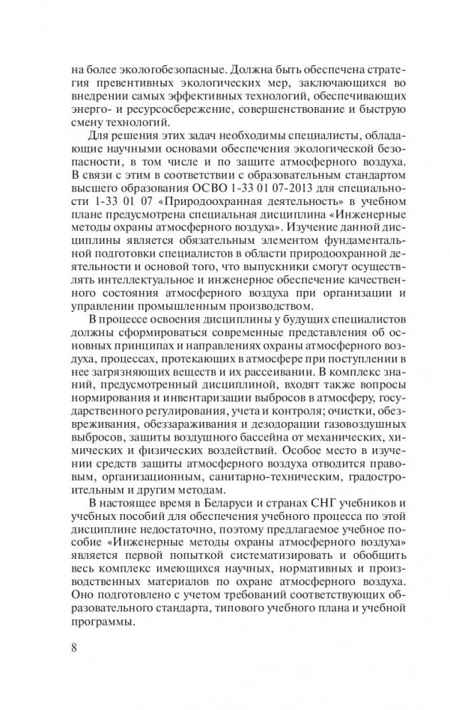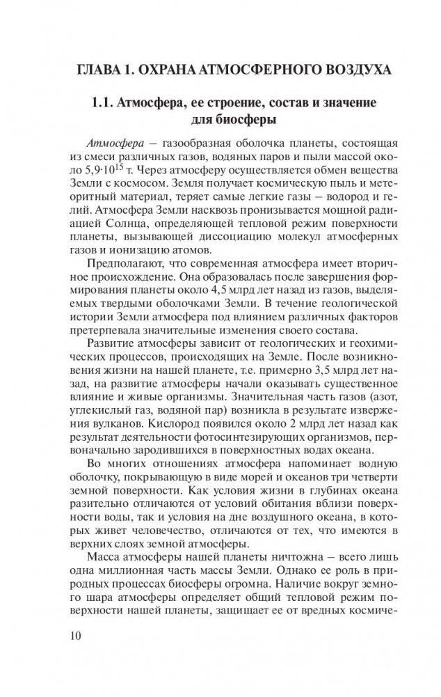 Описаны основные принципы и направления охраны атмосферного воздуха, процессы, протекающие в атмосфере при поступлении в нее загрязняющих веществ и их рассеивании. Рассмотрены вопросы нормирования и инвентаризации выбросов в атмосферу, государственного регулирования, учета и контроля; очистки, обезвреживания, обеззараживания и дезодорации газовоздушных выбросов, защиты воздушного бассейна от механических, химических и физических воздействий. Особое место в изучении средств защиты атмосферного воздуха отводится правовым, организационным, санитарно-техническим, градостроительным и другим методам. Представлены действующие законодательные и другие нормативные правовые акты по охране атмосферного воздуха.