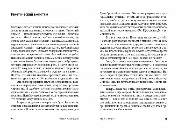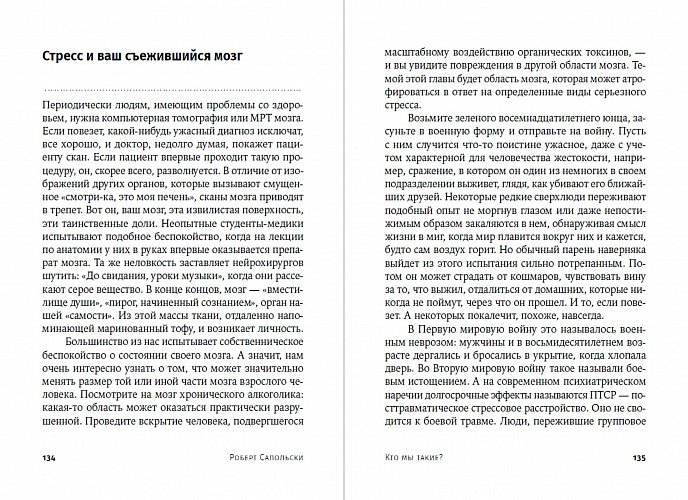 В книгу «Кто мы такие?» вошли лучшие статьи известного ученого и популяризатора науки Роберта Сапольски о человеке во всем его потрясающем многообразии. Три ее раздела, посвящены главным вопросам естествознания, включая влияние генов и среды на поведение, социальные, политические и сексуальные предпосылки поведенческой биологии и роль общества в формировании личности. Во всем, что описывает Сапольски — от брачных ритуалов грызунов до религиозных практик жителей тропических лесов, от выделения феромонов до мозговых паразитов, — он блестяще соединяет передовые научные открытия с ироничными и мудрыми наблюдениями о невообразимой сложности бытия.