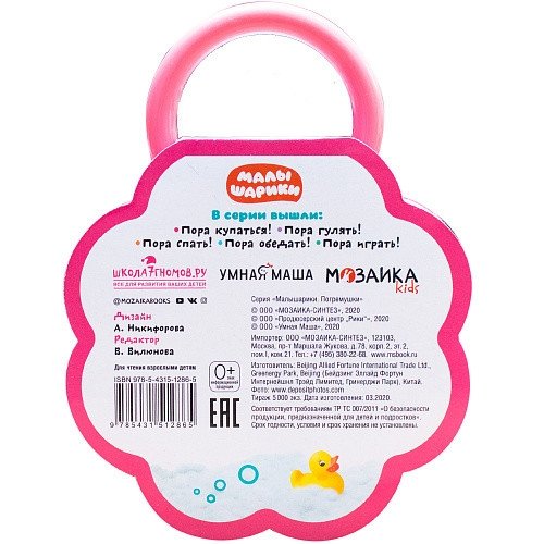 Книга «Пора купаться!» из серии «Малышарики. Погремушки» предназначена для знакомства с окружающим миром, развития речи и мышления у самых маленьких. В книге ребенок найдет 9 красочных фотографий предметов, окружающих его во время купания (ванна, полотенце, мыло, шампунь и пр.). Рассматривая их, малыш познакомится с полезными предметами и пополнит свой словарный запас. Книга-игрушка изготовлена из плотного картона и безопасной пены EVA, имеет удобный формат — ее легко держать в руках, можно взять в поездку или в гости.