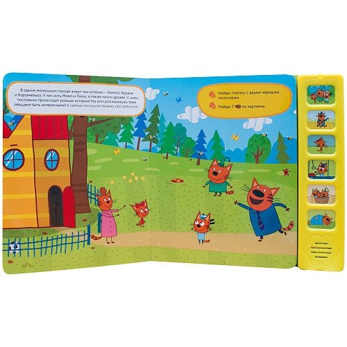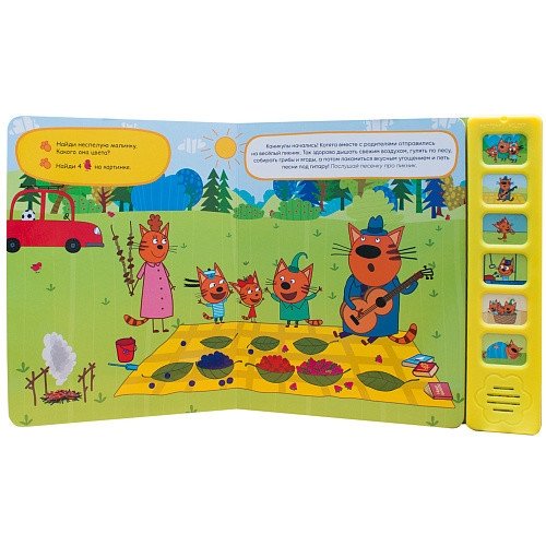 Книга «Котята на каникулах» с 6 звуковыми кнопками серии «Три кота. Звуковые книжки» — это не только история по приключениях Коржика, Карамельки и Компота на каникулах, но и сборник самых популярных песенок из мультфильма. В книге 6 звуковых кнопок – 6 куплетов из разных песен: заглавная песня о трех котах, веселая песенка про пикник, убаюкивающая колыбельная и другие. При повторном нажатии на кнопки звук можно выключать. Также на страницах книги ребенка ждут занимательные задания на развитие логики, внимания и обучение счету.