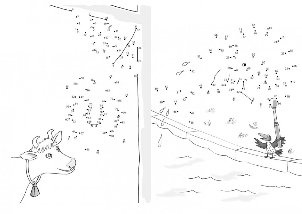 Мама Му и Кракс катаются на велосипеде, лазают по деревьям и ловят рыбу. Кто же там плавает в воде? И о чём мечтает Кракс? Соедини точки, и увидишь спрятанный рисунок.