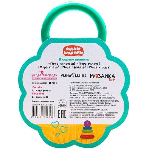 Книга «Пора играть!» из серии «Малышарики. Погремушки» предназначена для знакомства с окружающим миром, развития речи и мышления у самых маленьких. В книге ребенок найдет 9 красочных фотографий игрушек (кубики, пирамидка, кораблик, машинка, кукла и пр.). Рассматривая их, малыш познакомится с полезными предметами и пополнит свой словарный запас. Книга-игрушка изготовлена из плотного картона и безопасной пены EVA, имеет удобный формат — ее легко держать в руках, можно взять в поездку или в гости.