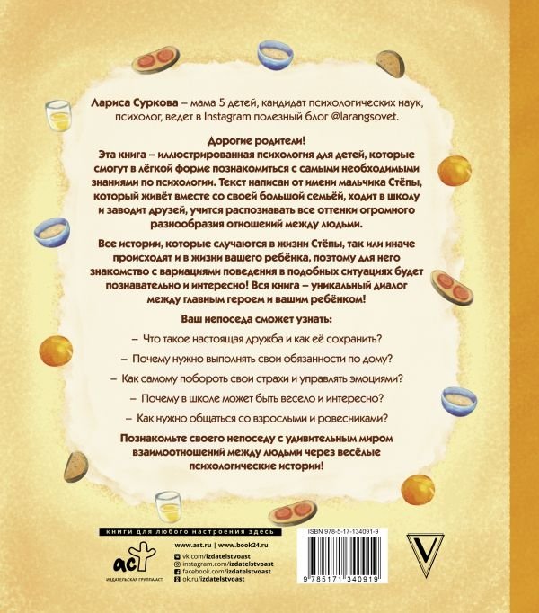 Дорогие родители! Эта книга – иллюстрированная психология для детей, которые смогут в легкой форме познакомиться с самыми необходимыми знаниями по психологии. Текст написан от имени мальчика Стёпы, который живёт вместе со своей большой семьёй, ходит в школу и заводит друзей, учится распознавать все оттенки огромного разнообразия отношений между людьми. Все истории, которые случаются в жизни Стёпы, так или иначе происходят и в жизни вашего ребёнка, поэтому для него знакомство с вариациями поведения в подобных ситуациях будет познавательно и интересно! Вся книга – уникальный диалог между главным героем и вашим ребёнком!
