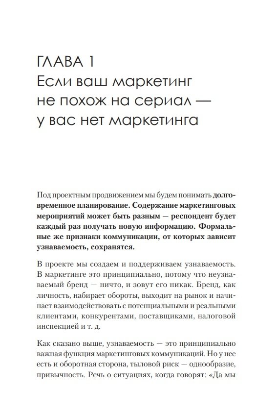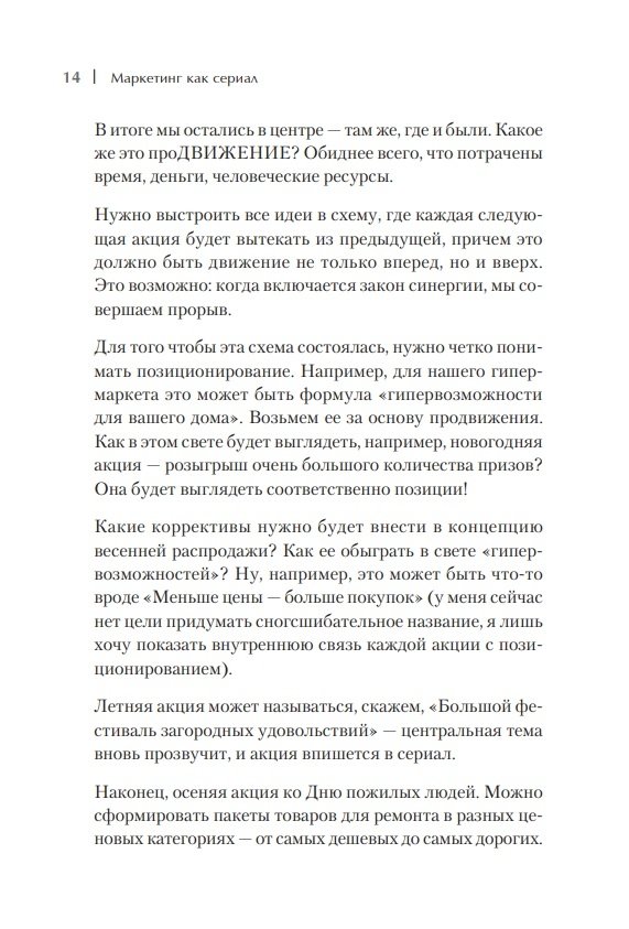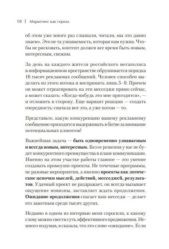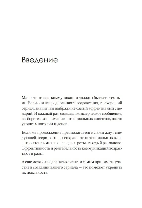 Если ваши маркетинговые коммуникации не предполагают продолжения, как хороший сериал, то каждый раз вы боретесь за внимание потенциальных клиентов с нуля, прикладывая много сил и вливая в продвижение значительные суммы. Если же ваш маркетинг предполагает продолжение, и люди ждут следующей «серии», то вы сохраняете людей «теплыми», и их не надо «греть» каждый раз заново. Таким образом, эффективность и рентабельность коммуникаций возрастает в разы. Можно предлагать клиентам самим принимать участие в создании вашего сериала, тем самым укрепляя их лояльность. Ия Имшинецкая — автор технологии системного продвижения — рассказывает, как выстроить линию маркетинговых коммуникаций, чтобы клиенты следили за ней и всегда ожидали продолжения. Издание будет полезно руководителям и собственникам бизнеса, а также тем, кто только собирается открыть собственное дело; руководителям и менеджерам отделов маркетинга, рекламы и PR, а также преподавателям курсов по маркетингу и маркетинговым коммуникациям.