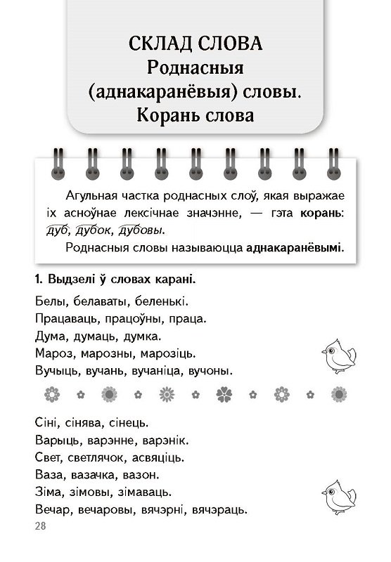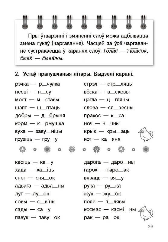 Побач з заданнем намалявана птушка. Калі практыкаванне выканана правільна, дзіця зафарбоўвае птушку зялёным колерам. Калі дапушчаны 1–2 памылкі – жоўтым колерам. Калі памылак 3 і больш – чырвоным. Такі прыём дапаможа развіць у вучняў навыкі самаправеркі, самакантролю і самаацэнкі.
