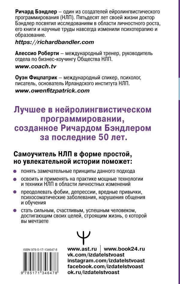 Опираясь на знания, полученные из этой книги, вы станете эффективным коммуникатором, сможете легко и быстро производить глубокие и устойчивые личностные изменения, преодолевать любые психологические ограничения, излечивать фобии и психосоматические расстройства, устранять нежелательные привычки и зависимости, нарушения обучения, производить изменения в отношениях с партнерами и близкими вам людьми.