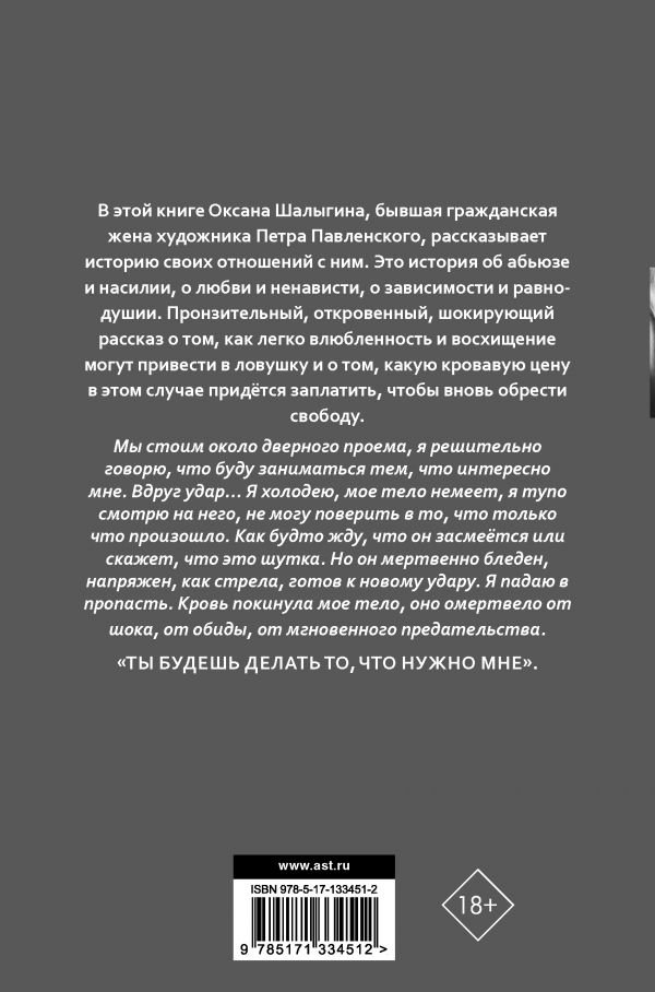 В этой книге Оксана Шалыгина, бывшая гражданская жена художника Петра Павленского, рассказывает историю своих отношений с ним. Это история об абьюзе и насилии, о любви и ненависти, о зависимости и равнодушии. Пронзительный, откровенный, шокирующий рассказ о том, как легко влюбленность и восхищение могут привести в ловушку и о том, какую кровавую цену в этом случае придётся заплатить, чтобы вновь обрести свободу.