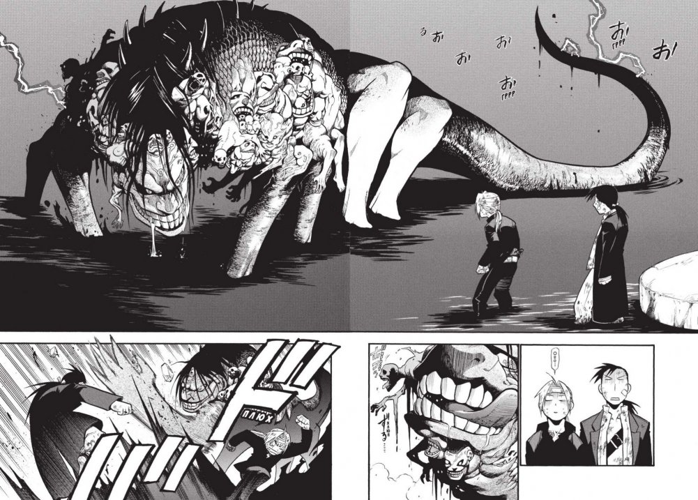 На фоне политических интриг в Централе, вызванных известиями об истинной натуре Кинга Брэдли, Обжорство жаждет сожрать Роя Мустанга, но закусывает в итоге не им. Проглоченные Обжорством Эд Элрик и «принц-недоумок» Лин оказываются в очень странном месте, «по колено в кровище». Раскрыть Эду глаза на истинное предназначение места готов Зависть, заодно он поделится и другими фактами. Какое же он чудовище! Победить его в истинном облике будет непросто. В это же время оставшийся один на один с Обжорством Ал требует, чтобы гомункул отвёл его к своему истинному отцу. Лицо отца станет большим сюрпризом для Элриков…