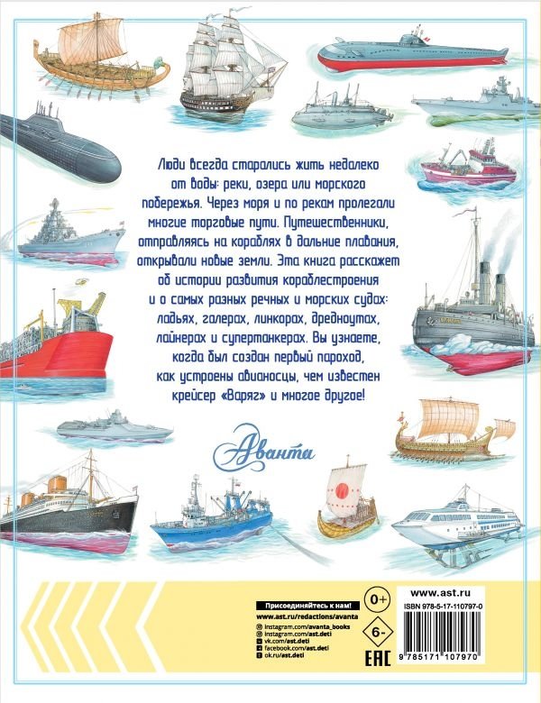 Люди всегда старались жить недалеко от воды: реки, озера или морского побережья. Через моря и по рекам пролегали многие торговые пути, а путешественники, отправляясь на кораблях в дальние плавания, открывали новые земли. Эта книга расскажет об истории развития кораблестроения и о самых разных речных и морских судах: ладьях, галерах, линкорах, дредноутах, лайнерах и супертанкерах. Вы узнаете, когда был создан первый пароход, как устроены авианосцы, чем известен крейсер «Варяг», как выглядели венецианские галеры и многое-многое другое.
