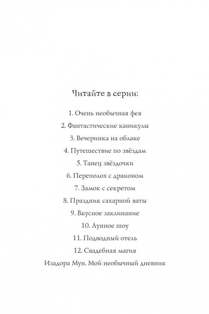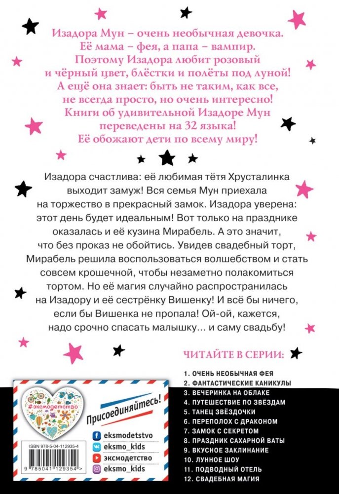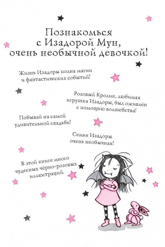 Изадору и её семью ждёт удивительный праздник: её тётя Хрусталинка выходит замуж! Свадебные колокольчики, цветочные венки, платье подружки невесты – волшебство, да и только! Но на свадьбу приехала Мирабель, кузина Изадоры, известная проказница. Вот и на этот раз не обошлось без её проделок: увидев великолепный свадебный торт, Мирабель решила уменьшиться с помощью магии и незаметно им полакомиться! Но её магия случайно задела Изадору и её младшую сестрёнку Вишенку! К ужасу Изадоры, малышка неожиданно пропала! Ой-ой, нужно срочно спасать Вишенку, иначе свадьба будет испорчена!