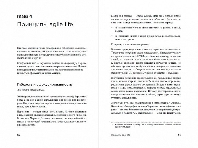 Метод agile life предполагает поэтапное движение к целям без насилия над собой и основан на новейших исследованиях в области нейрофизиологии, методах самокоучинга и использовании цикличных agile-спринтов. В нем заложена идея, что любого рода деятельность должна представлять собой регулярные циклы, состоящие из четырех элементов: Plan (планирование), Execute (реализация), Analyze (анализ) и Recharge (восстановление). Каждому элементу цикла посвящен раздел книги.