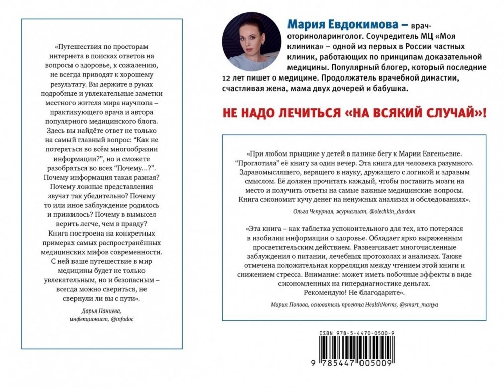 Не надо лечиться «на всякий случай» и попадать на удочку популярных медицинских мифов. В этом уверена Мария Евдокимова, потомственный врач, соучредитель первого в России медицинского центра, работающего по принципам доказательной медицины. Она развенчивает модные сегодня представления о том, как сохранить здоровье. Стоит ли верить всему, что пишут в интернете? Полагаться ли на Инста-докторов и как найти на самом деле знающего врача? К чему может привести бездумное применение витаминных добавок? Так ли страшен глютен, как им пугают? Можно ли пить молоко взрослым? Как избавиться от страха, что внутри нас живут паразиты и перестать мучать печень чистками и детоксами? Как на самом деле лечить герпес и кандидоз? Вы прочтёте подробные и понятные советы как без вреда сделать так, чтобы жить долго и отлично себя чувствовать, – профессионально, популярно, легко. Эта книга сэкономит деньги на бессмысленные анализы, лекарства и процедуры и сохранит ваши нервы. То, что доктор прописал!