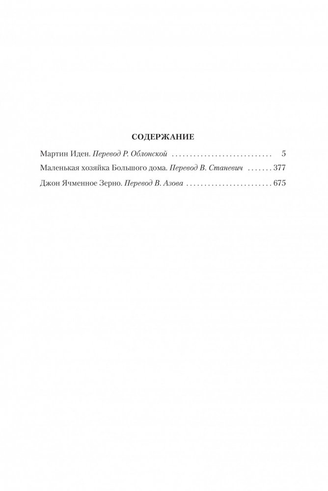 В книгу включены три произведения знаменитого американского писателя Джека Лондона, стоящие особняком в его литературном наследии и расширяющие его хрестоматийный образ классика приключенческой литературы. «Мартин Иден» - история простого моряка, который случайно оказался в светском обществе и из-за внезапно вспыхнувшей любви к прекрасной, возвышенной и утонченной Руфи Морз решил круто изменить свою жизнь, ступив на путь литературного творчества; однако путь этот оказывается весьма и весьма тернист… В основе сюжета романа «Маленькая хозяйка большого дома», написанного за год до смерти писателя, – любовный треугольник, отношения в котором отчасти перекликаются с тем, что происходило на калифорнийском ранчо Джека Лондона и его жены Чармиан зимой конца 1912 – начала 1913 года. Эту книгу, шокировавшую современников Лондона откровенностью сексуальных фантазий и описанием неодолимого соблазна адюльтера, автор считал лучшим своим произведением. Повесть «Джон Ячменное Зерно» – во многом автобиографическая, горькая и беспощадная в своей откровенности исповедь человека, чья жизнь прошла в дружбе с заглавным персонажем, олицетворяющим алкоголь, – открывает нам еще одну неожиданную ипостась личности Джека Лондона.
