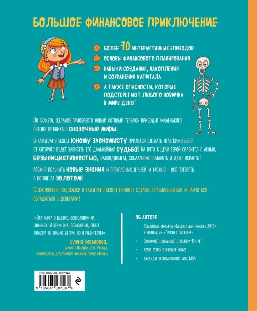 Хотите научить ребенка обращаться с деньгами? Более 70 интерактивных эпизодов помогут познакомить ребенка с основами бюджета, накопления и сохранения капитала, а также опасностями, которые подстерегают любого новичка в мире денег. В основе сюжета – желание приобрести новый сотовый телефон, которое приводит маленького путешественника в разнообразные сказочные миры. В каждом эпизоде юному экономисту придется сделать нелегкий выбор, от которого будет зависеть его дальнейшая судьба! На пути к цели герою придется сразиться с ленью, безынициативностью, равнодушием, желанием обмануть и даже украсть. В ходе игры можно обогатиться новыми знаниями и прекрасными друзьями, а можно - все потерять в погоне за золотом! Стихотворные подсказки в каждом эпизоде помогут сделать правильный шаг и освоить финансовую грамотность.